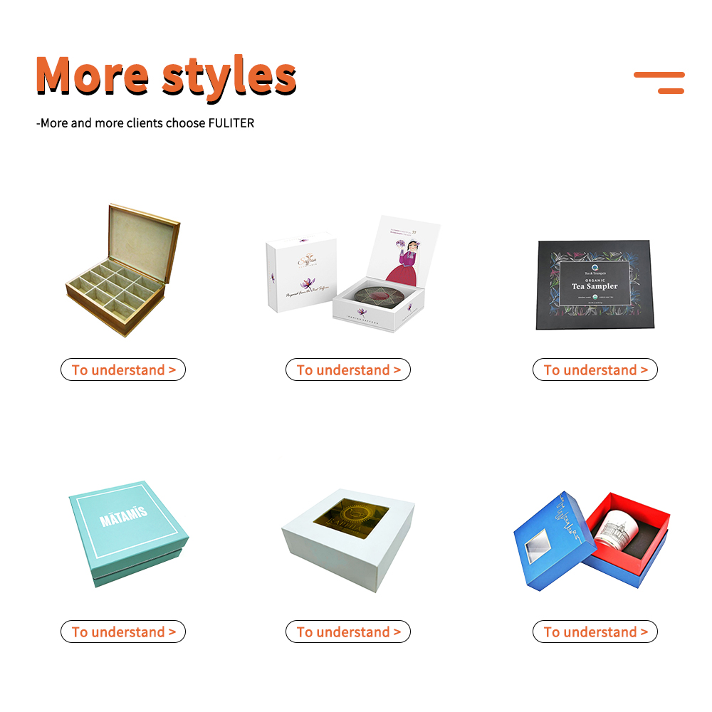 பரிசுப் பெட்டி பேக்கேஜிங் என்பது காகித பேக்கேஜிங் பெட்டியின் உயர்தர பேக்கேஜிங் வடிவமாகும், இது பல்வேறு பரிசுகள் மற்றும் பொருட்களில் பரவலாகப் பயன்படுத்தப்படுகிறது. ஃபுலிட்டர் பேக்கேஜிங்கில் பன்முகப்படுத்தப்பட்ட வடிவமைப்புகள் மற்றும் உயர்தர பொருட்களைக் கொண்டுள்ளது, இது தயாரிப்பின் உயர்தர படத்தைக் காட்டுகிறது.